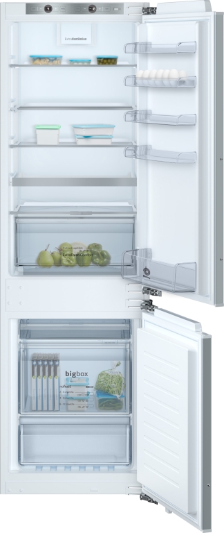 Clase de eficiencia energética F. Dimensiones de encastre (alto x ancho x fondo): 177 x 56 x 55 cm Sistema de integración de puerta fija Sistema eficiente de iluminación mediante LED Electrónica táctil digital interior Tecnología NoFrost en el congelador Refrigeración "Súper" y Congelación "Súper" con autodesconexión Cajón ExtraFresh Comfort para frutas y verduras con control de humedad y guías de fácil apertura Cajón de gran capacidad "Big Box" Bandejas de cristal de seguridad, 1 de ellas extraíbl